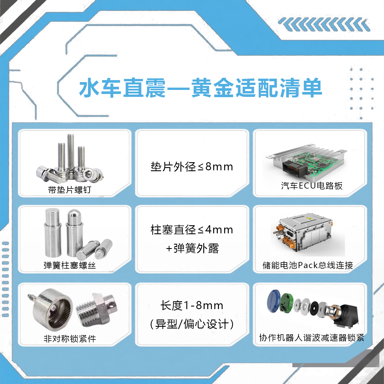 兼容尺寸范圍:支持M0.6-M8異形零配件(最小如手機SIM卡螺絲,最大如汽車ECU帶墊螺釘,支持非標定制)。